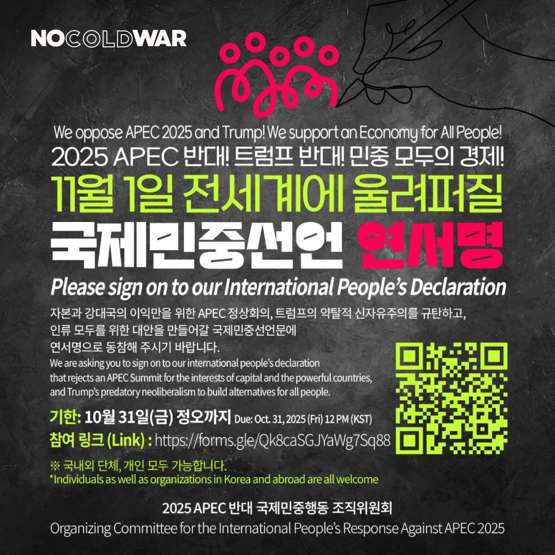 The APEC Leaders Summit will convene in Gyeongju from Oct. 31 to Nov. 1st. In response, left and progressive activists and organizations from APEC member economies and from around the world will also be gathering. We will hold our International People’s Summit to carry the voices of the world’s people, who oppose APEC 2025 and Trump. So, we hereby adopt the following International People’s Declaration.
